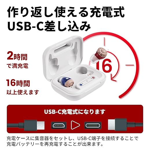 便利なUSB-C充電&携帯ケース:付属のコンパクト(USB-C対応)で、外出先でも簡単充電。最大連続16時間使用可能。旅行やお出かけに最適な集音器です。