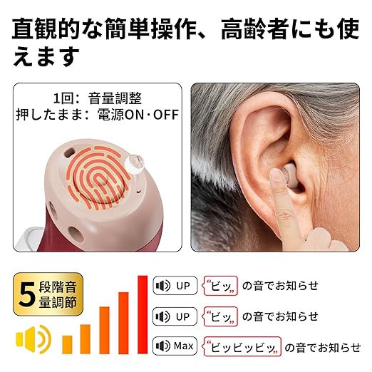 音質と増幅性能に優れた集音器:人の声をクリアに聞こえるよう鮮明に再現し、高音質かつ高い増幅力を実現。バランスド・アーマチュア(BA)型スピーカー搭載で、高齢者にも聞き取りやすく心地よい音量と音質を提供します。
