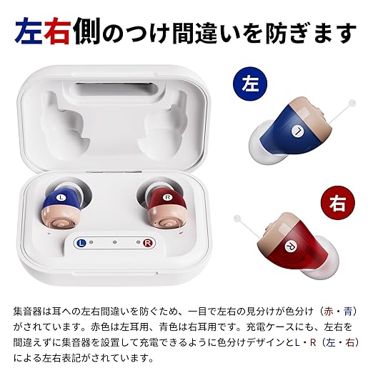 左右一目瞭然のカラーデザイン:青色(右)と赤色(左)のカラーリングで、集音器の左右が瞬時に判別可能。装着時の間違いを防ぎ、高齢者の使い勝手を考慮した設計です。
