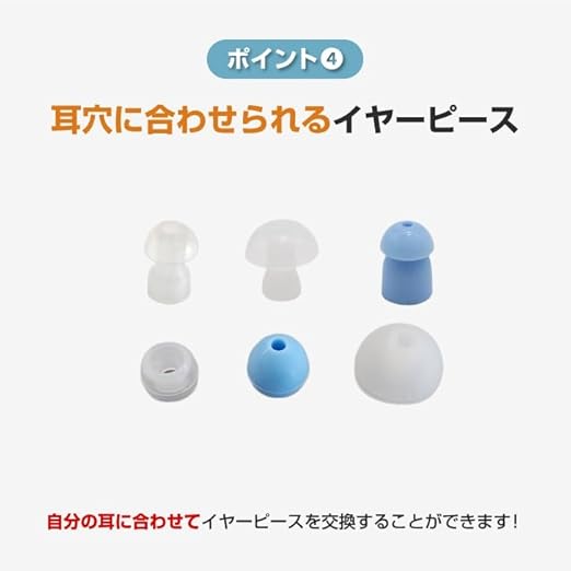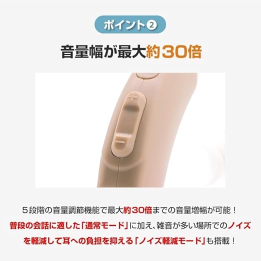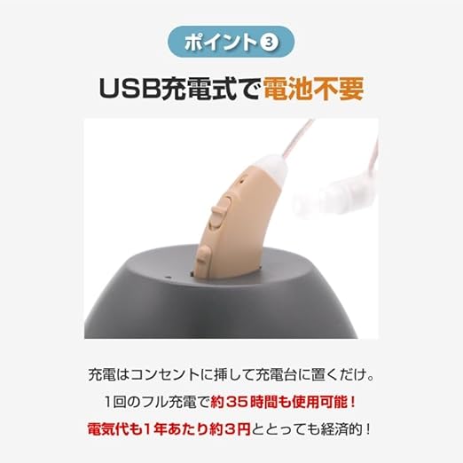 ●サイズ/約幅1.5 奥行0.8 高さ3.5cm ●重さ/約5g ●素材/本体:ABS樹脂、先端ゴム:シリコン ●仕様/最大作動時間:約35時間、集音モード:2種(通常モード・ノイズ軽減モード)、音量調節:5段階調節(最大約30倍) ●セット内容/本体、充電スタンド、USB充電ケーブル、イヤーピース(6種)、取扱説明書