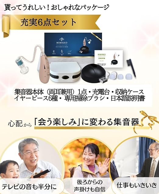 ✅プレゼントにも最適なMIMIKKO専用ボックス入り。合6点の充実セットです。セット内容:左右兼用集音器1点・充電台・専用収納ケース・イヤーピース6種類・専用掃除ブラシ・日本語説明書
