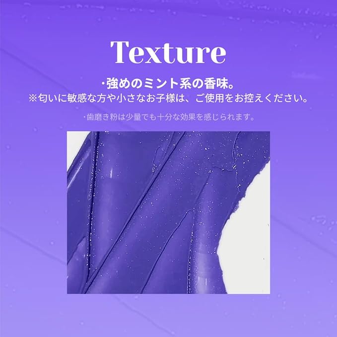 【パープルコレクター歯磨き粉の特徴】①補色の原理を利用した「パープルコレクティングテクノロジー」と、汚れによる着色をケアしながらこれからの着色までケアする「3STEP美歯メカニズム」で優れたトーンケアをサポートします。②コーヒーのような飲み物からの着色を防ぐことに役立ちます。
