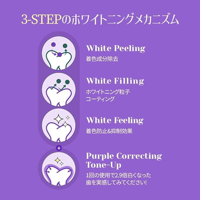 【毎日もっと白く】 歯磨き粉だけで毎日白くなる歯! 3年に研究の末に誕生した歯磨き粉の美白の新しい方式!<br>1STEP:ホワイトニング粒子で歯に付着した着色成分を押し出します。 <br> 2STEP:ホワイトニング粒子が吸着し、その場を埋めて追加着色を抑制します。 <br> 3STEP:着色除去と着色抑制でより白く!