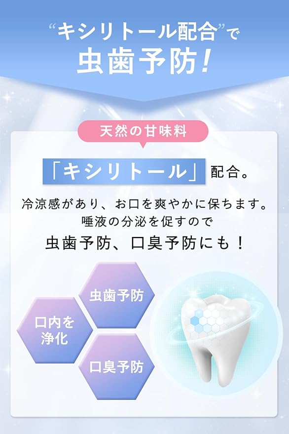 【キシリトールで虫歯・口臭予防】天然の甘味料キシリトールを配合。お口を爽やかに保ちながら、虫歯や口臭予防にも効果的。