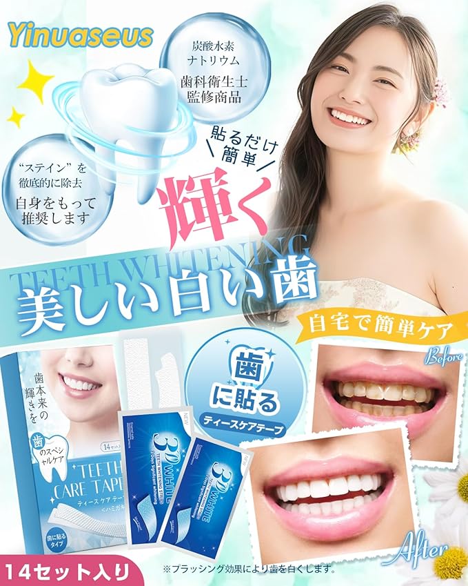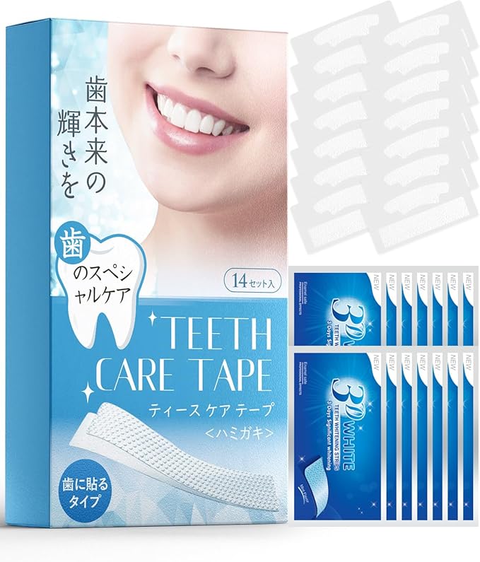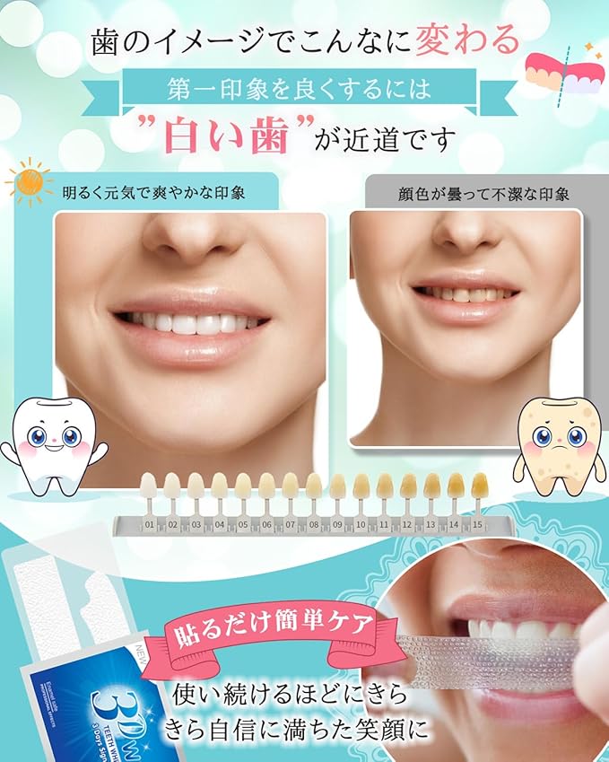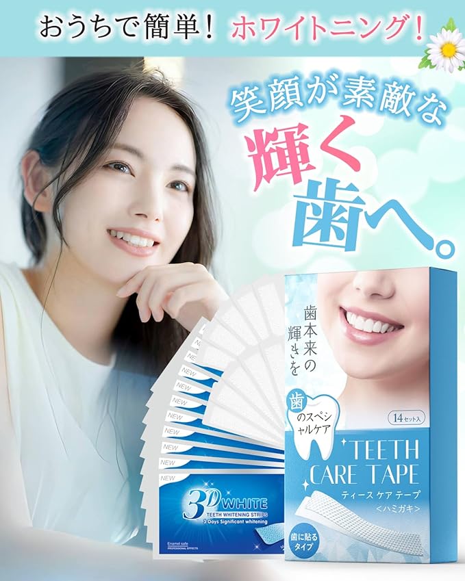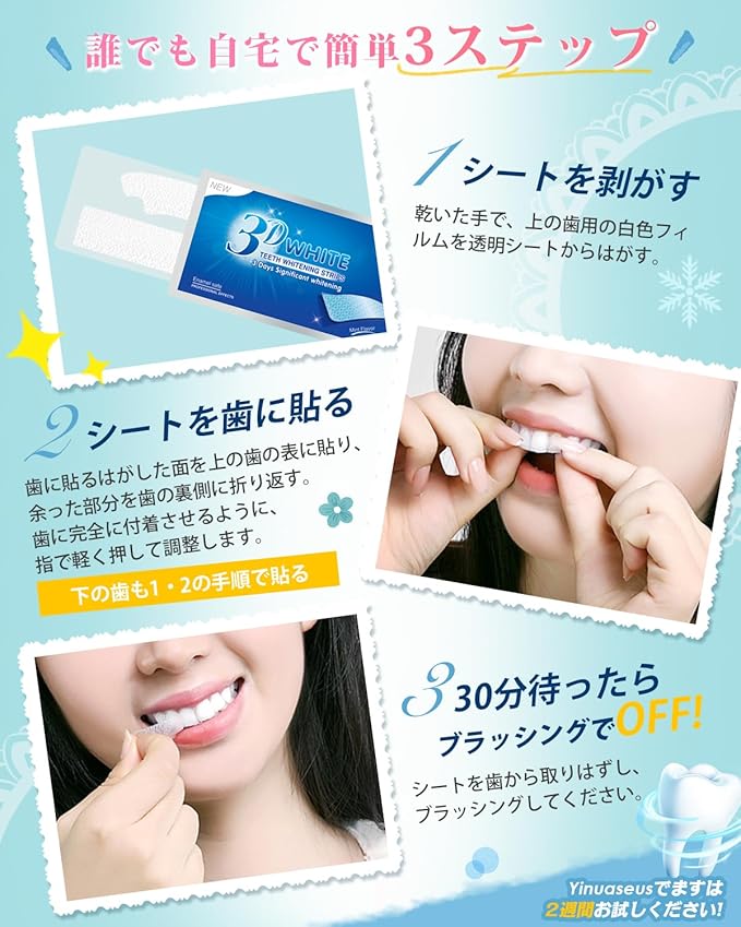 【簡単な使い方】ワイトニングシートの使い方 1.テープからフィルムを剥がし、を見ながら上下の歯にテープを貼り付ける。2.テープの成分がなじむまで待つ(20~30分)。3.20~30分後、テープを剥がし、歯ブラシでよくブラッシングしてください。その際、お手持ちの歯磨き粉をご使用いただいても結構です。4.最後に口をよくすすいで完了。