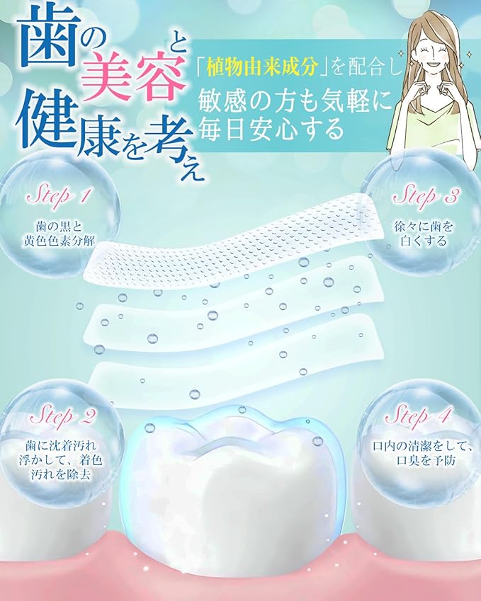 【安全な成分】ワイトニングシートは研磨剤を使用していないので、歯の表面を傷つけません。ホワイトニングシートは日常オーラルケアの用品であり、予めご了承ください。
