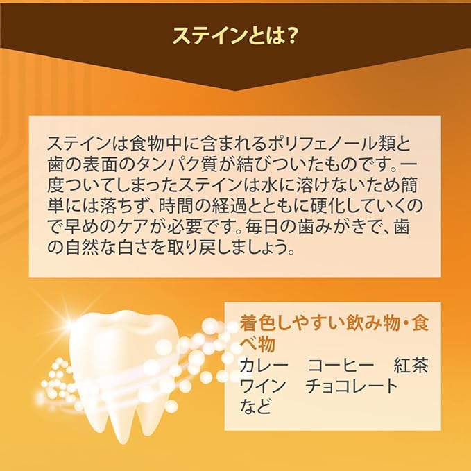 コーヒー・紅茶・ワインなどによる着色汚れを除去するために考えられたステインケア専用歯みがきです。