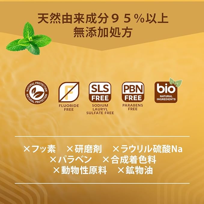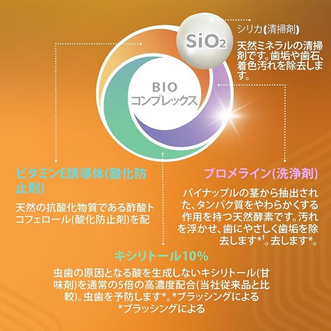 PVP(乳化安定剤)が着色汚れを除去して歯を白くします。嫌な臭いを中和する特殊な香料を配合しているので、さわやかな息を長持ちさせます。