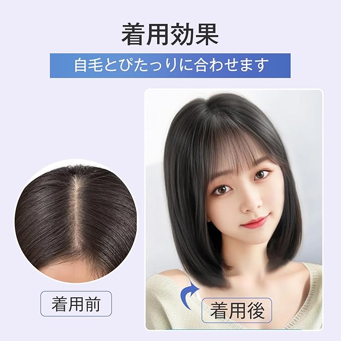 自然に馴染む:前髪は生え際から毛先まで12CMぐらい、サイドとバックは分け目から毛先まで18CM~20CMぐらい、耳ぐらいまでの髪の長さです、ご自毛が短くでも長くても、自然に馴染みます。サイズが小さければ毛量も少ないので、カバーしたい範囲が小さい、つむじのみカバーしたい、薄毛や白髪が気になり始めの方におススメです。