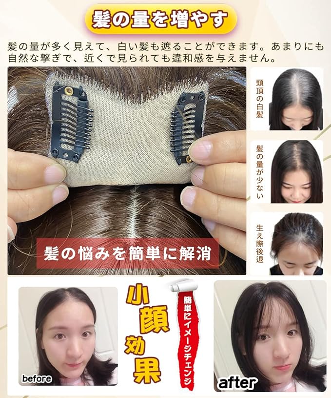 「注意事項について」1.定期的に髪で洗うことで酸っぱい匂いの防止とよりに本来の髪と近い髪質にすることができます。 2.発送時において、クセや折り目などがついてしまう場合があります。100%なので、ポイントウィッグを洗って、乾燥した後でストレートになっております。ほとんどの場合は軽く手ぐしやブラッシングをしてあげると治まりますが、それでも直らない場合はドライヤーをあてて形を整えてください。コテなどで行っていただいても結構です。3.ヘアピースはで、手作りのため、他のカラーの糸と白髪が混ざっている場合がございます。 検品時にできる限り取り除いておりますが、完全に取り除くことは難しいため、気になられる場合はご着用前にご確認頂き、 必要があれば根元から抜いて下さい。同時に、ウィッグ特有の匂いが気になる場合は風通しの良い日陰で数日干してからご使用下さい。4.写真と実物の色が液晶の具合によって若干異なることがあることをご了承ください。もし不満なところやご不明点があれば、どうぞお気軽にお問い合わせください。