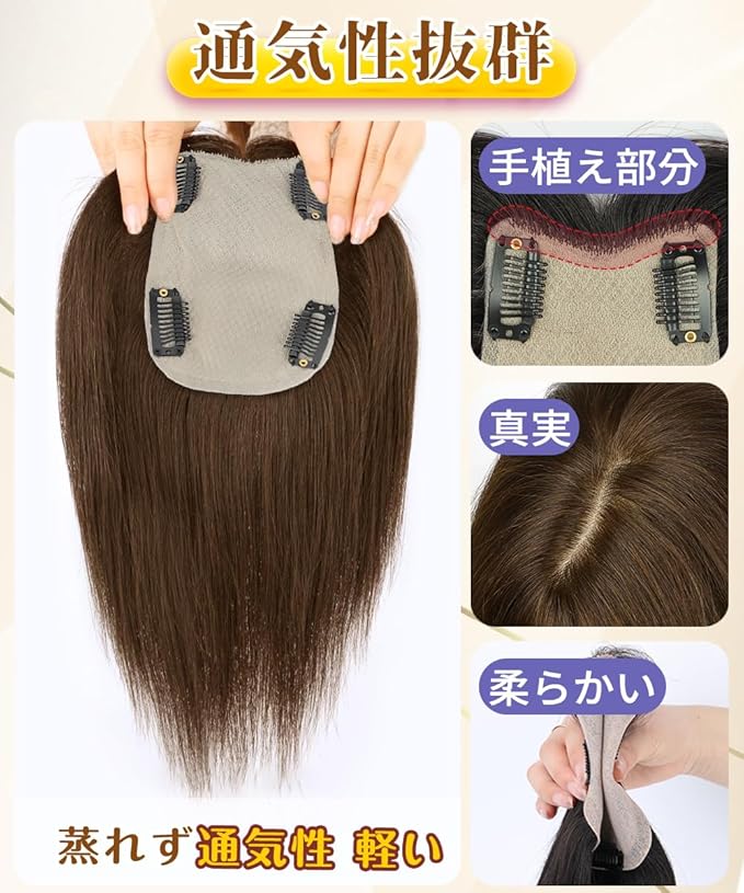 「進めポイント」1.100%なので、まるで自分の髪のような真実感。2.優れる通気性、ベースは通気性の優れるメッシュネット構造になっており、そのメッシュ構造は優れる通気性を提供し、一日中被っても頭皮に蒸れる感じがしません。 3.薄くて軽いので、一日中被っても、決して負担になりません。4.100%のため、本来の髪型に合わせて切ったり染めたり、パーマかけたりできます。