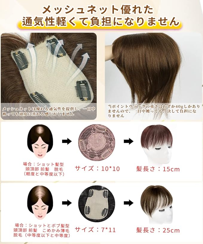 「部分ウィッグ商品情報」①(幅):横約7cm*縦11cmほど。②の長さ:前髪:約10CM 後ろ髪:約25CM ③カラー:自然色(日本人の一般的な髪の色) & モカ色 ④重さ:40g