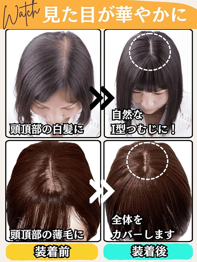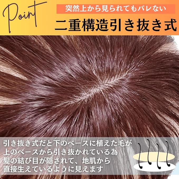 ✅【極自然なI型つむじ】②特徴:【美人premium+】はつむじや頭頂部周りの薄毛や生え際の白髪等のお悩みの方にオススメ。毛量は少な目で足りない部分を全体的にカバーするのでごわつかず、ウィッグ、付け毛、カツラ初心者に最適な商品。植毛方法にもこだわり、二重構造&引き抜き式を採用。高級100%の為、ヘアアイロン、ヘアカット、も使用可