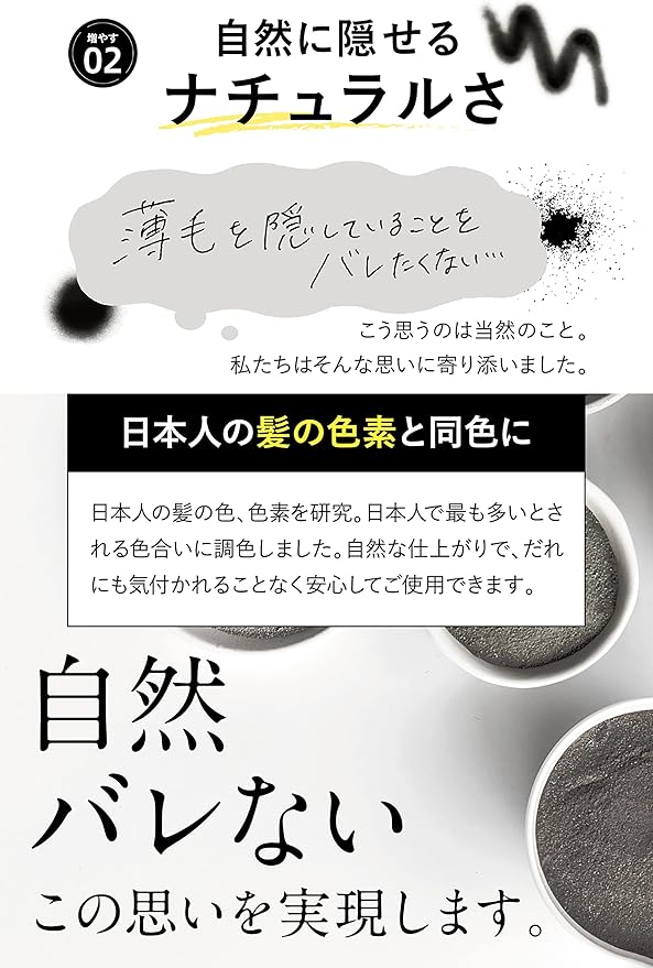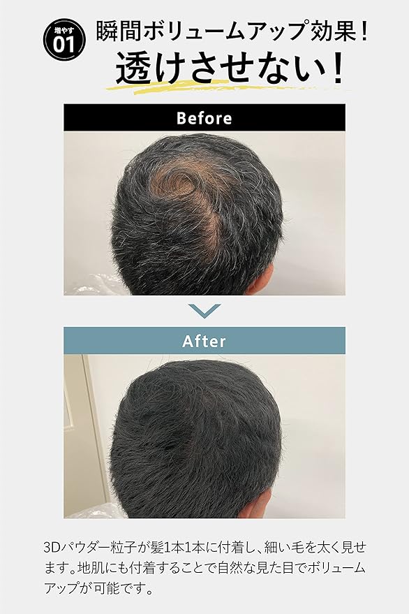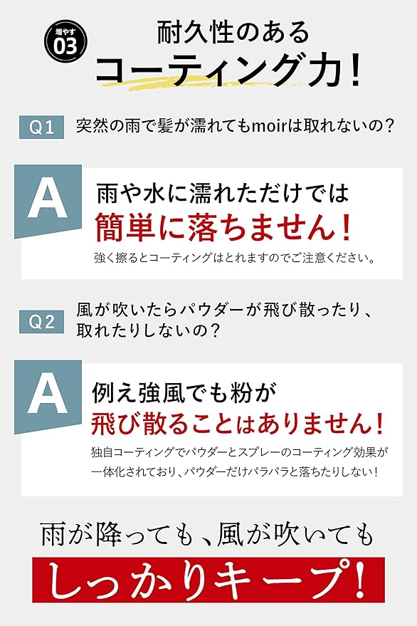 ✅【耐久性のあるコーティング力】水で濡らしたり強い風を当てても乱れない耐久力の強い薄毛かくし。雨や汗に濡れても、突然強風が吹いても落ちないから外出時も1日安心。※強く擦るとコーティングが落ちる恐れがあります。