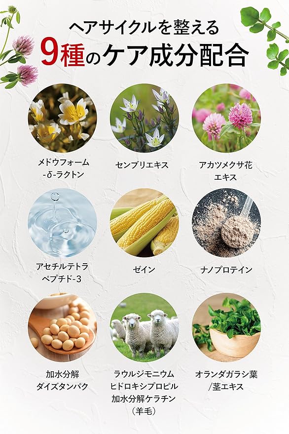 ✅【9種のヘアサイクルを整える成分と7種のうるおい成分配合】9種の成分がヘアサイクルを整えます。特に「オランダガラシ」は頭皮や毛髪を健やかに保つサポートをします。さらに7種のうるおい成分が紫外線や洗浄力の強いにより乾燥した頭皮や毛髪に水分を補給します。