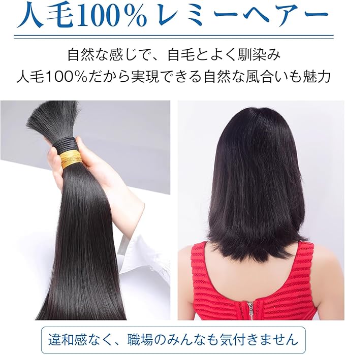 100%レミーヘア:レミーヘアとは、キューティクルを均一に整えた高品質なのことです。絡まりにくく、指通りが滑らかで、自然なツヤと柔らかさを兼ね備えています。本物の髪のような質感を楽しめます。