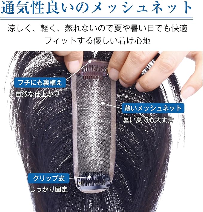 通気性良いのメッシュネット:高い通気性を持ち、暑い日でも頭皮の蒸れを防ぎます。軽量で圧迫感がなく、肌ネット仕上げにより自然でリアルな外観を実現。抗菌・発汗効果もあり、サラッとした着け心地でベタつかず、爽やかな印象をキープします。
