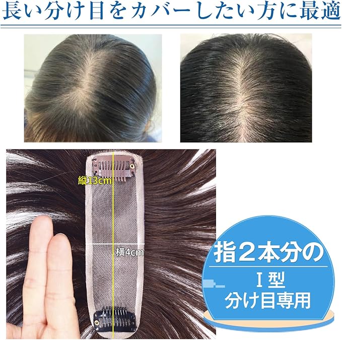 分け目に関するお悩みを解決:指2本分のI型部分ウィッグで長い分け目をカバーしたい方や気になる根元の薄毛・白髪・プリンを瞬間にカバーしたい方に最適です。