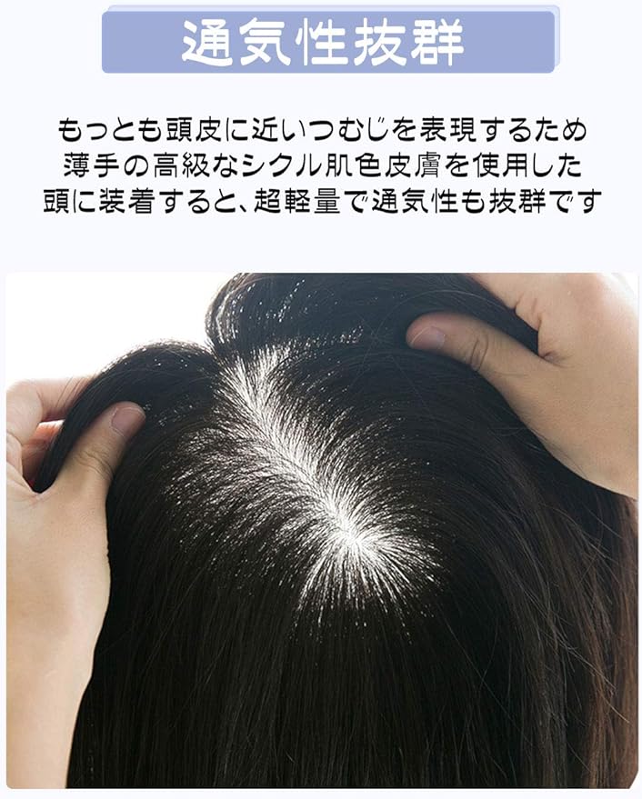 3.総手植え植毛:頭頂部全面が手植え製で、熟練の職人が一本一本毛の向きを変えて丁寧に毛を植えているので、毛流れが自然で、毛が根元からふわりと立ち上がります。可能な限り立体的で空気感のナチュラルなつむじを再現。前髪の捲る度がご自由に変わることができます。