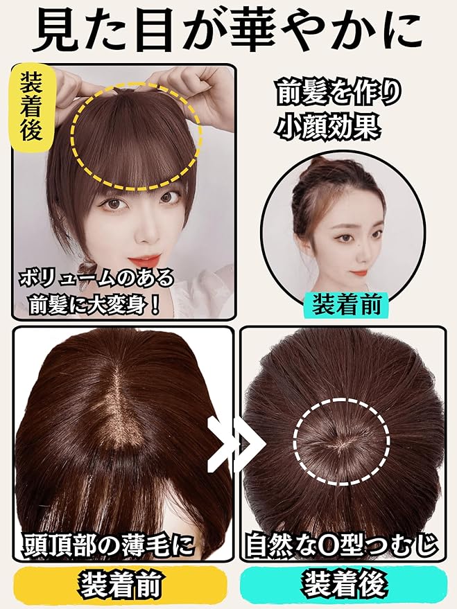 ✅【愛され前髪】②特徴:「気軽にpremium+」は薄毛のお悩み、前髪のイメチェン、頭頂部やつむじのちょっと足し等、うぃっぐやかつら初心者に最適の商品。前髪もついている為、前髪ウィッグとしても使用可能。少し長めの横髪で小顔効果も追加。100%で採用ですので、ヘアアイロン・ヘアカット・・ドライヤー・ヘアカラーも使用可