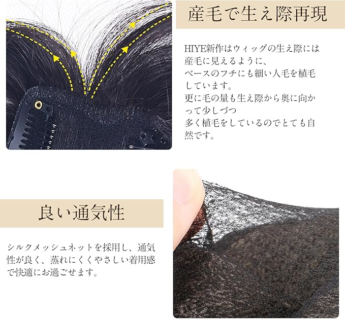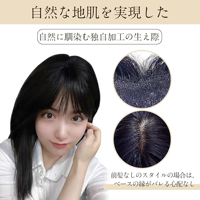 自然な生地肌:自然に馴染む独自加工の生え際で、前髪なしのスタイルの場合は、ベースの縁がバレる心配しません。