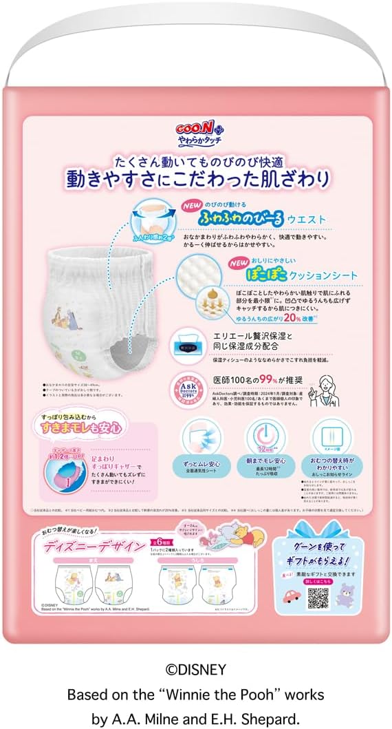 「全面通気性シート」でずっとムレ安心。「最長12時間※3たっぷり吸収」で朝までモレ安心。※3 当社調べ(おしっこの量は個人差があります。お子様の状態をみて、適宜交換してください。)