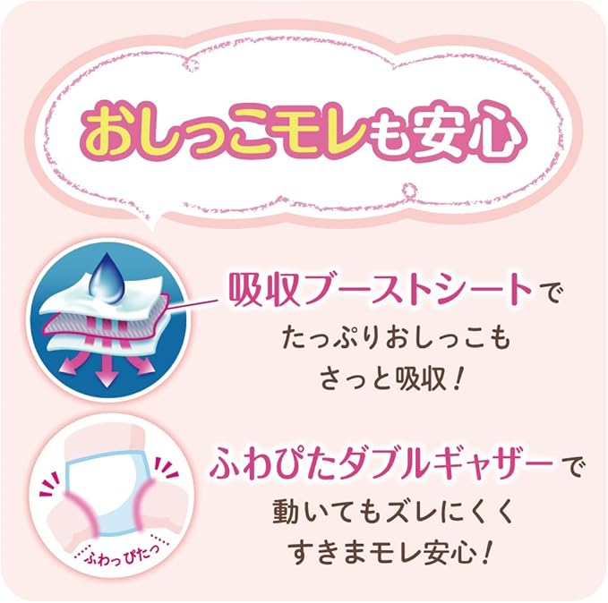 「全面通気性シート」でずっとムレ安心。「最長12時間※3たっぷり吸収」で朝までモレ安心。※3 当社調べ(おしっこの量は個人差があります。お子様の状態をみて、適宜交換してください。)