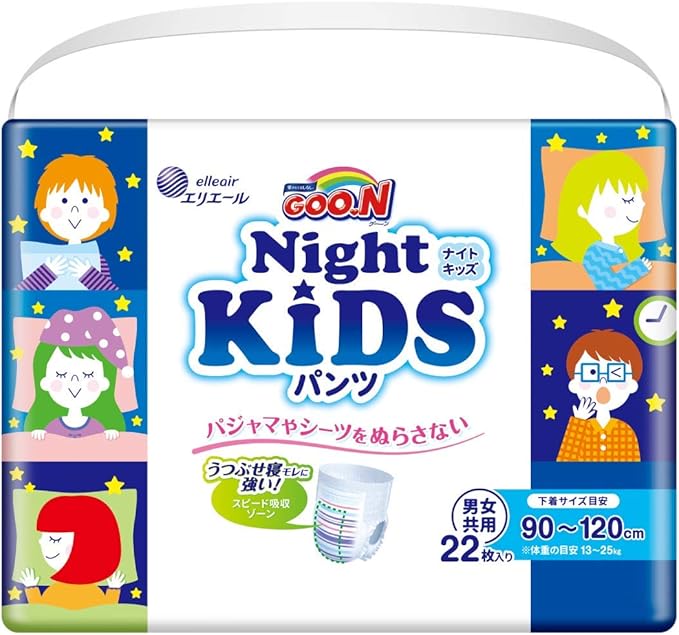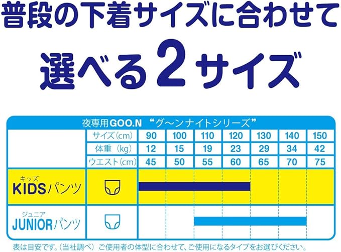 グーンから夜用パンツが登場。サイズはKIDS90cm~120cm(13kg~25kg)。うつぶせ寝に強い前側スピード吸収だから、BIGサイズを卒業したお子さまにも。