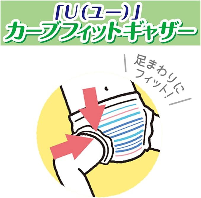 【「U(ユー)」カーブフィットギャザー】大量に排尿しても吸収体を持ち上げる構造を採用しました。足まわりのフィット感が保てて、おむつと足まわりの隙間ができにくい構造です。