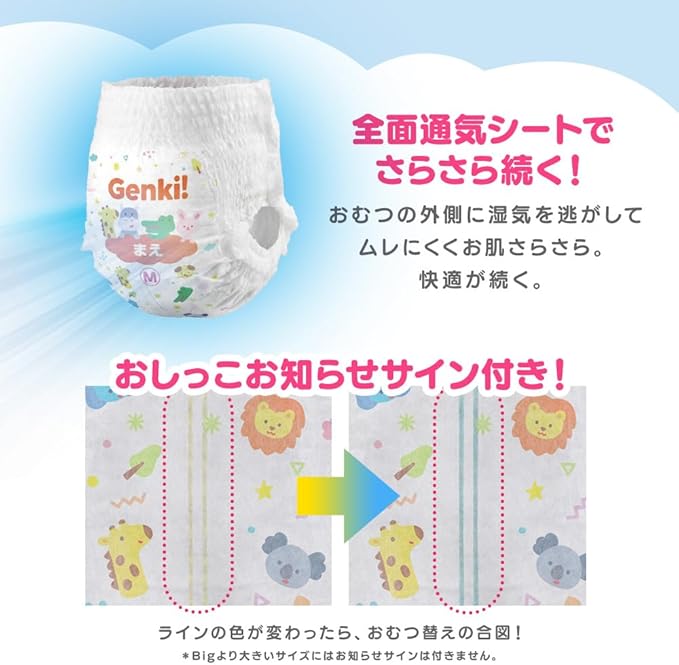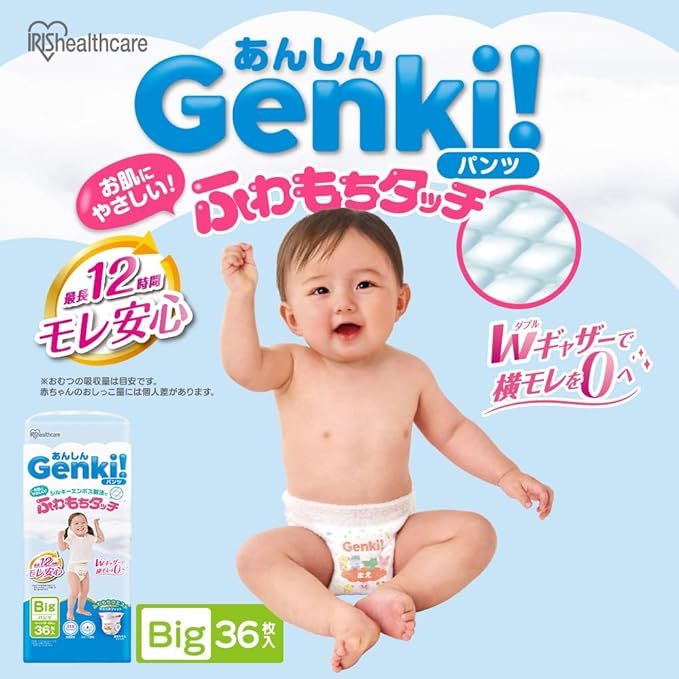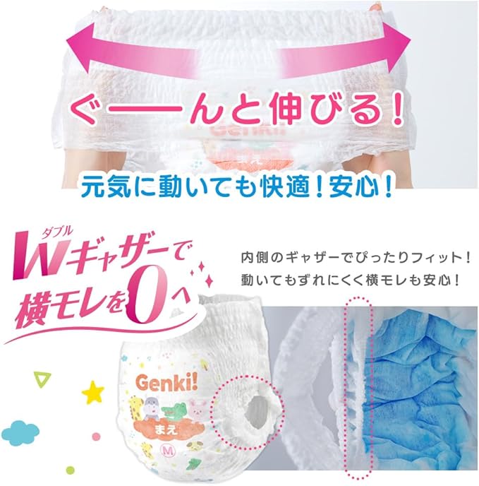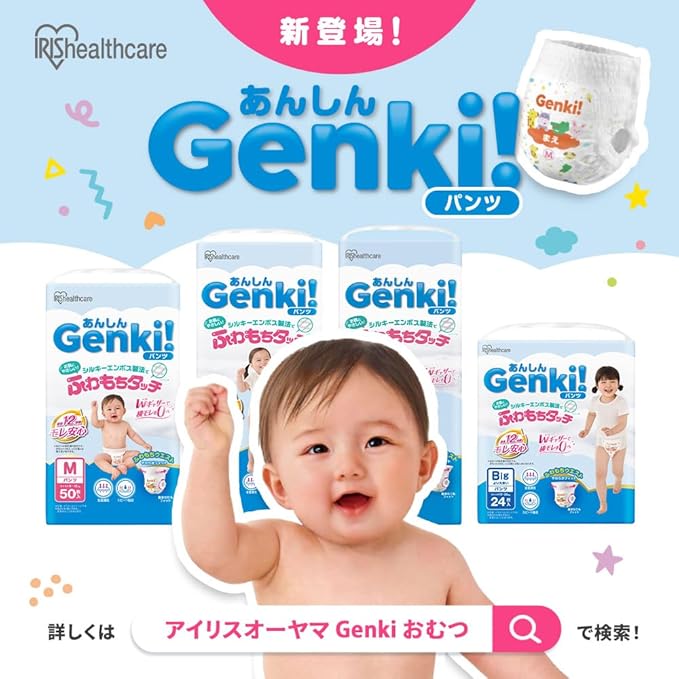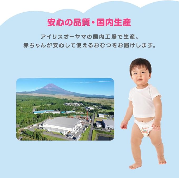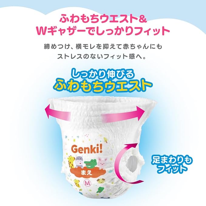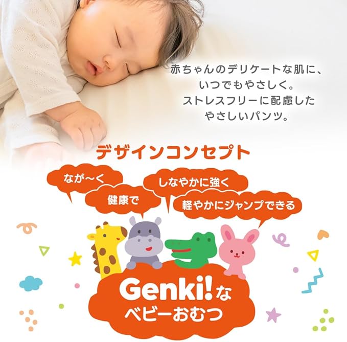あんしん“Genki!パンツ”。赤ちゃんのデリケートな肌に、いつでもやさしく。ストレスフリーに配慮したやさしいパンツ。ベビーおむつ。