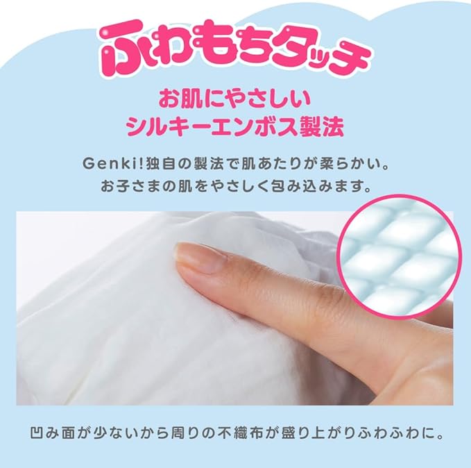【シルキーエンボス製法でふわもちタッチ】不織布の凹み面が少なく、盛り上がりが大きなふわふわ仕様!肌当たりがやわらかく、しっとりなめらか。お子さまの肌をやさしく包み込みます。