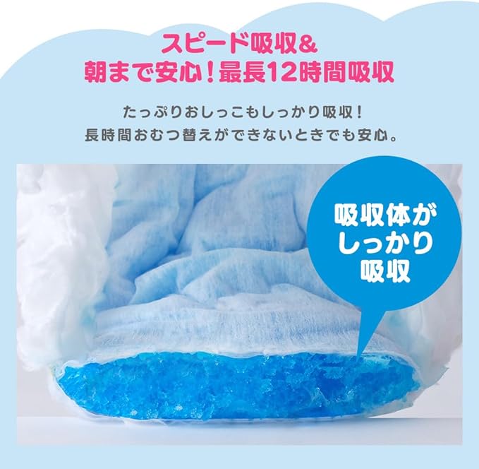 【最長12時間モレ安心(※)】Wギャザーで横モレを0へ:内側の2つのギャザーでぴったりフィット、横モレも安心。/スピード吸収:しっかり吸収、逆戻りもしにくい。(※おむつの吸収量の目安です。赤ちゃんのおしっこの量には個人差があります。)
