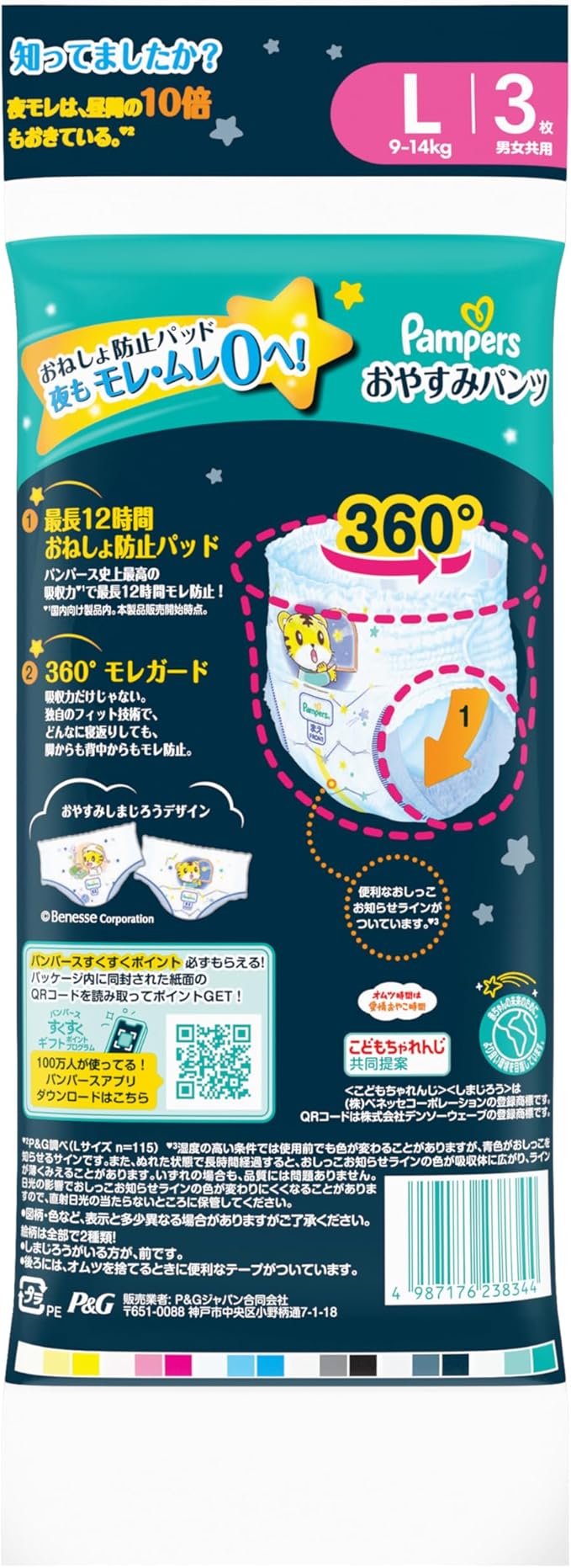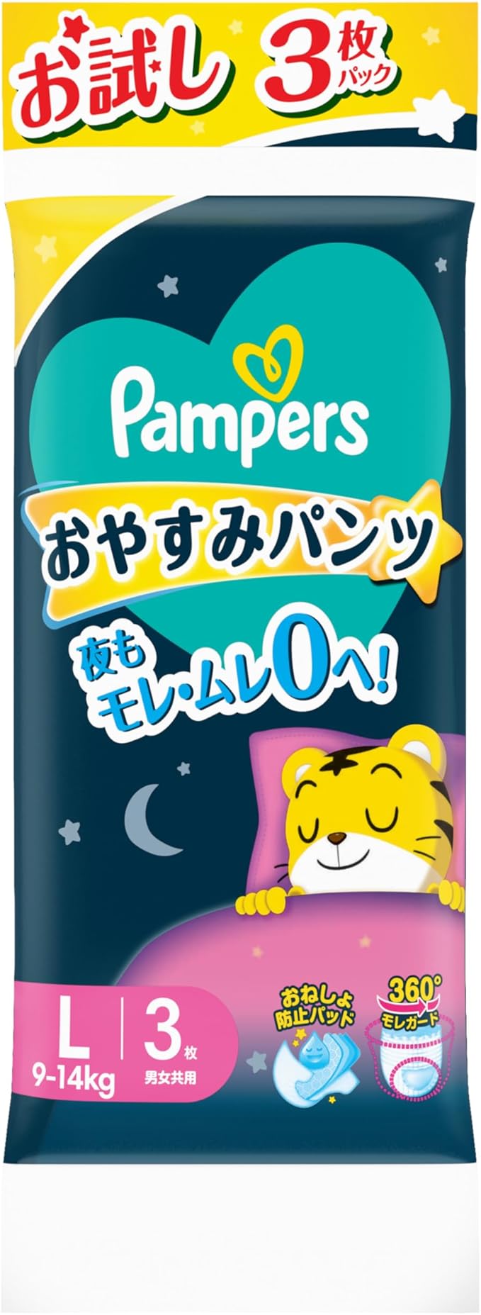 【パンパース おやすみパンツ おねしょ防止パッド新採用!】夜は昼の10倍モレやすい*。おねしょ防止パッドを搭載し、一晩中のおしっこを受け止めます。夜もモレ・ムレ安心。 * P&G調べ(Lサイズ, N=115)
