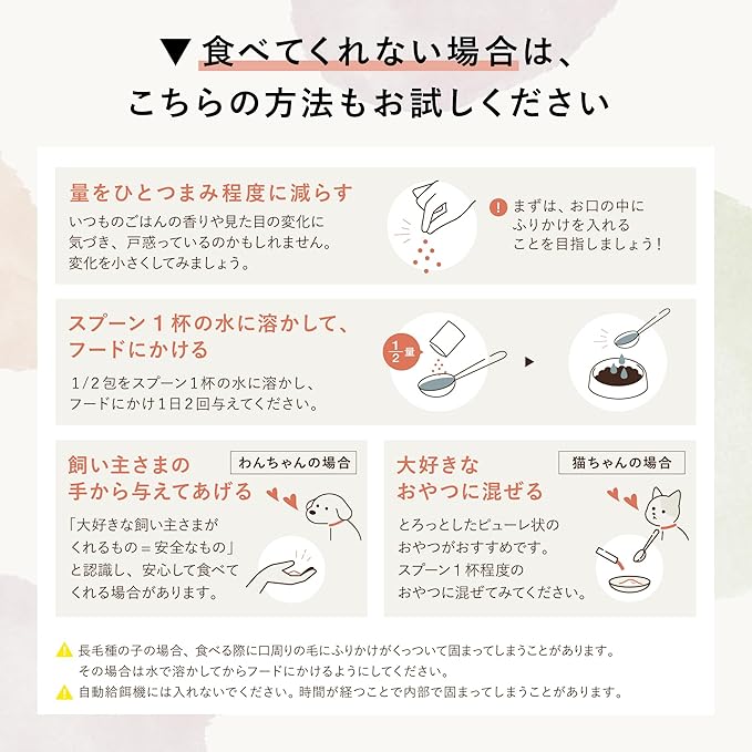 :獣医師とペット栄養管理士が共同開発した、ふりかけ状の口腔ケアです。人向けの歯磨き市場でも注目を集める自然派原料のマスティック樹脂を使用。口内の汚れを取り除くリベチン含有卵黄粉末や口臭に働きかけるカテキン類などがお口の健康を維持します*2。ふりかけ状のため、いつものごはんに振りかけるだけの簡単習慣で使いやすい口腔ケアサプリです。*噛むことで歯垢の沈着を抑え、お口の健康を維持する
