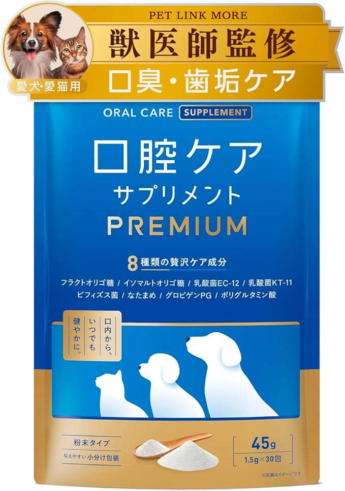 ✅【獣医師監修口腔ケア】PETLINKMORE 口腔ケアPREMIUMはいつものごはんにさっとかけるだけ 簡単に口腔ケアできるふりかけタイプのデンタルケアです