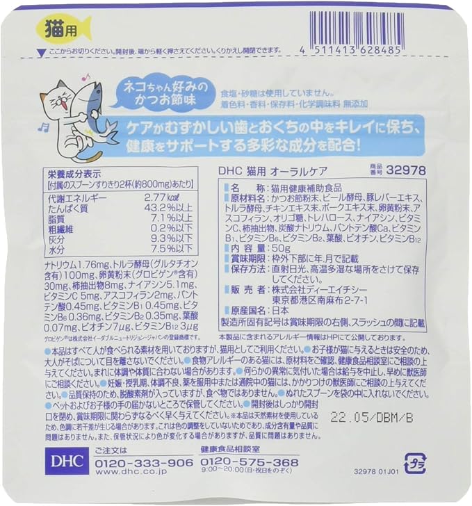 原材料:かつお節粉末、ビール酵母、豚レバーエキス、トルラ酵母、チキンエキス末、ポークエキス末、卵黄粉末、アスコフィラン、オリゴ糖、トレハロース、ナイアシン、ビタミンC、柿抽出物、炭酸ナトリウム、パントテン酸Ca、ビタミンB1、ビタミンB6、ビタミンB2、葉酸、ビオチン、ビタミンB12