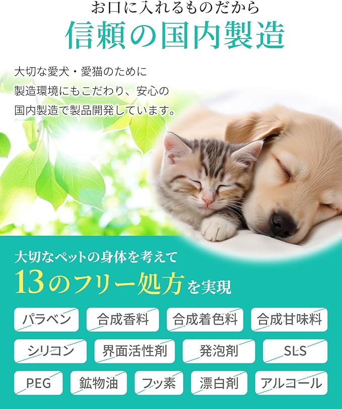 素材の特徴 自然由来成分, 13のフリー処方, 国内製造, ヒューマングレード, 獣医師監修