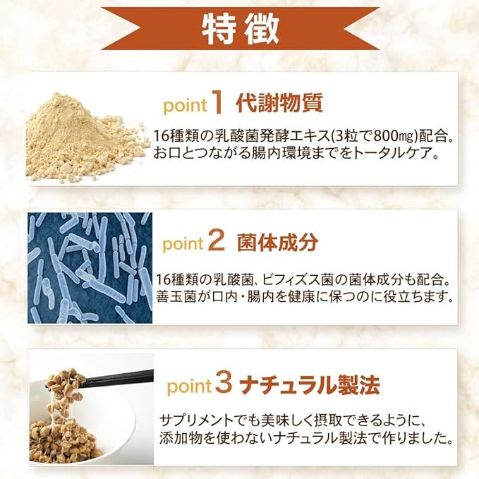 【善玉菌の補給】3粒で800mgの乳酸菌発酵エキスを摂取可能。
