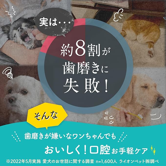 おいしいチキン風味で食いつき◎。犬の好きな味にこだわりました 嗜好性にも配慮した設計。毎日のごはんにかけるだけで、ストレスなく口臭・口内ケアができます。