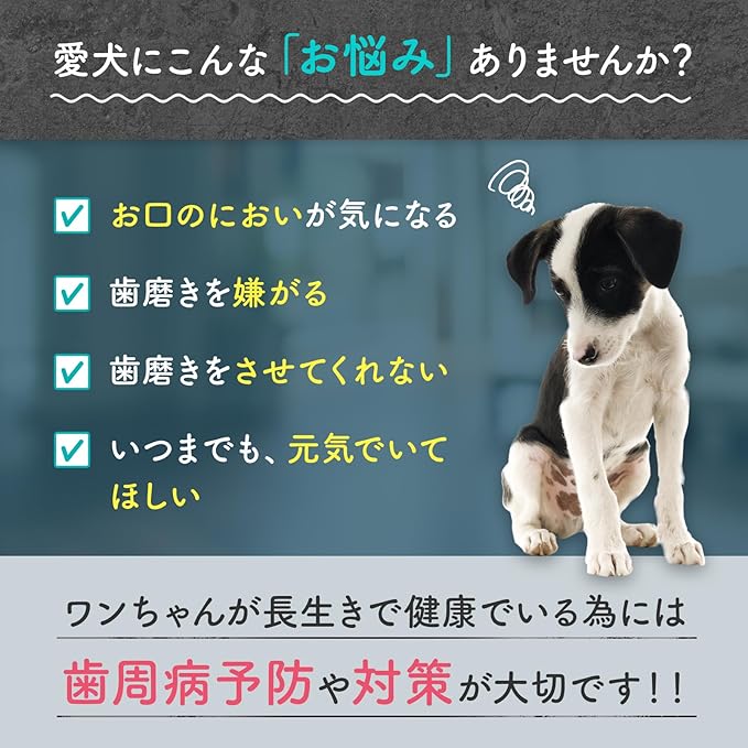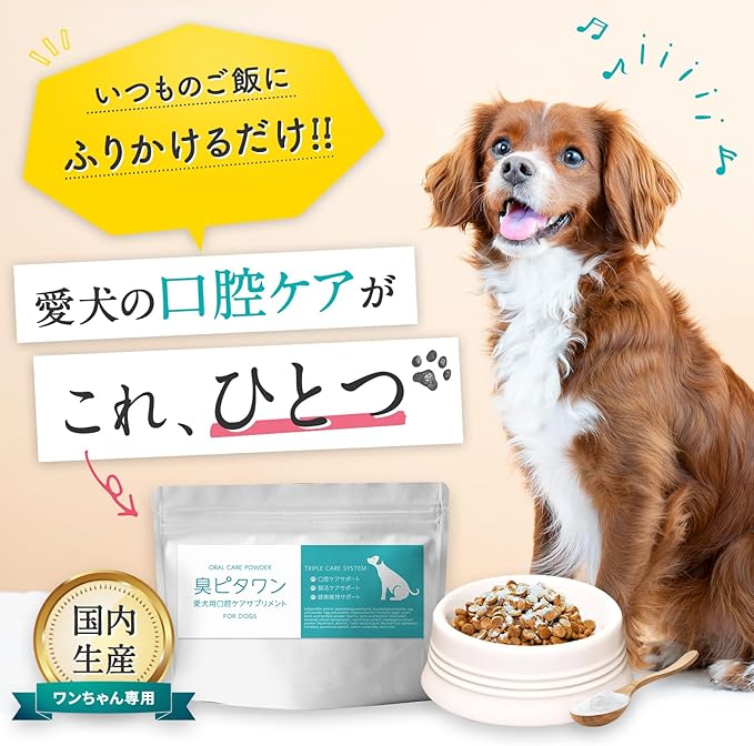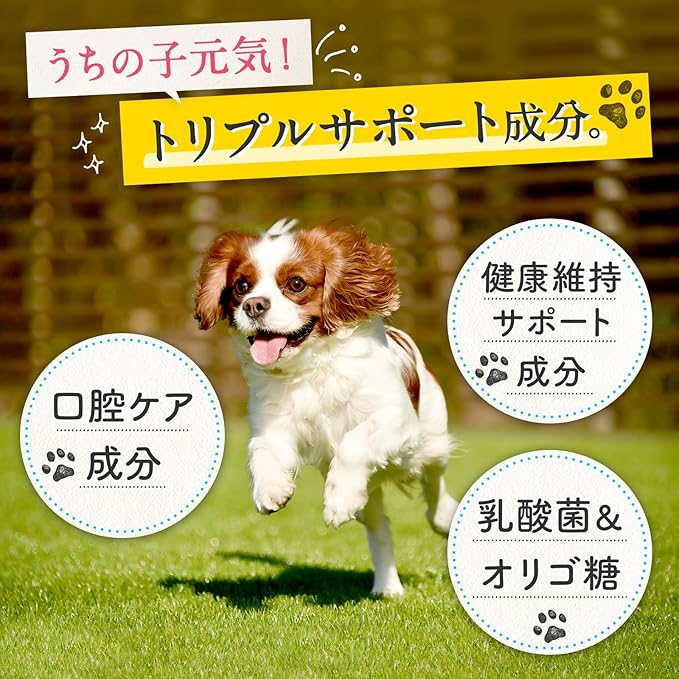 商品特長 食事にかけるだけの簡単ケア。 毎日のごはんに振りかけるだけ。歯磨きが苦手な愛犬にも無理なく続けられます。, 全犬種・全年齢対応&計量しやすい粉末タイプ。内容量45g。毎日の食事に合わせて調整しやすく、小型犬から大型犬まで幅広く使えます。, トリプルケアで愛犬の口腔環境をサポート 口腔内・腸活・健康のバランスを整え、口臭の気になるニオイに配慮します。, 嗜好性の高いチキンの風味でごはんの時間が待ち遠しくなる美味しさ。食いつきも抜群です。, ヒューマングレード&国内製造で安心安全。人も食べられる品質基準の原料を使用し、国内工場で製造しています。, KT‑11乳酸菌・グロビゲンPGなど機能性成分を厳選配合。 栄養補助として、口内細菌のバランス維持に配慮した成分設計です。食事にかけるだけの簡単ケア。 毎日のごはんに振りかけるだけ。歯磨きが苦手な愛犬にも無理なく続けられます。, 全犬種… 表示を増やす