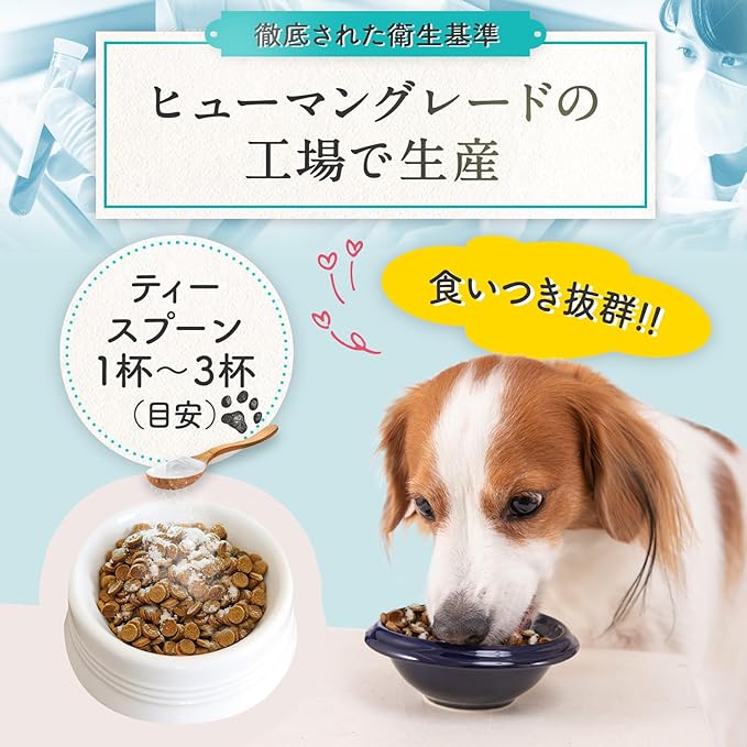 無添加・ヒューマングレード原料を使用し、安心の国産品質 保存料・香料・着色料不使用。国内工場で製造された、人間向けレベルの品質基準に準じた安全なサプリです。