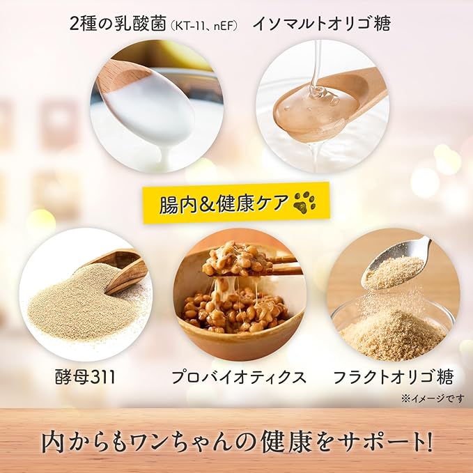原材料にもこだわったシンプル処方。犬の体に不要なものは入れない設計 難消化性デキストリン、イソマルトオリゴ糖、卵黄末、乳酸菌末、アスコフィラン、ナタマメ抽出物、シャンピニオンエキス末、柿抽出物、トレハロースなどを使用。香料・保存料・着色料不使用。