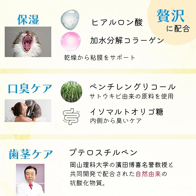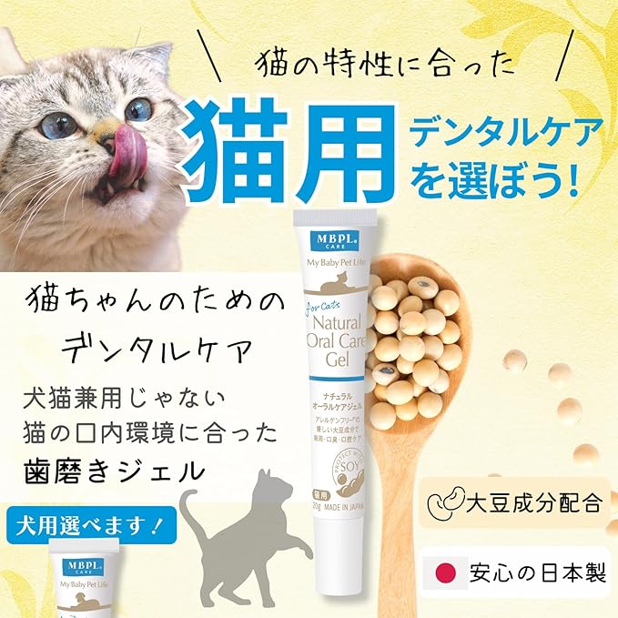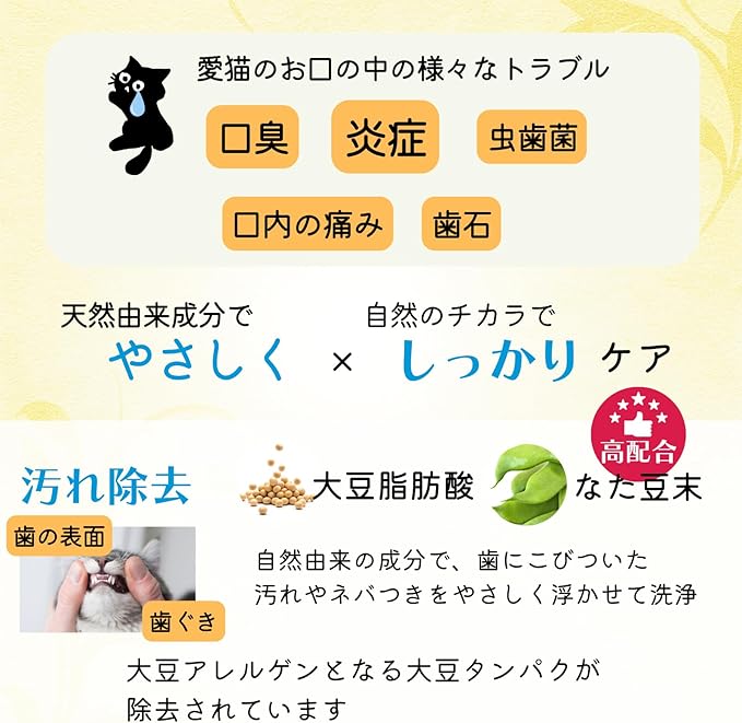 猫のデリケートな口腔内にも安心して使用できる、大豆由来成分を使用。