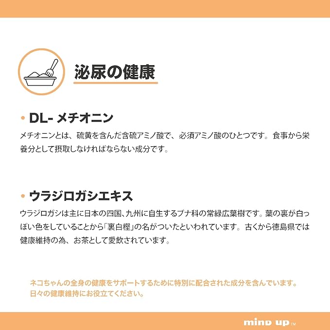 ✅泌尿器の健康維持に配慮:DL-メチオニン&ウラジロガシエキスで、トイレの悩みが気になる猫にも
