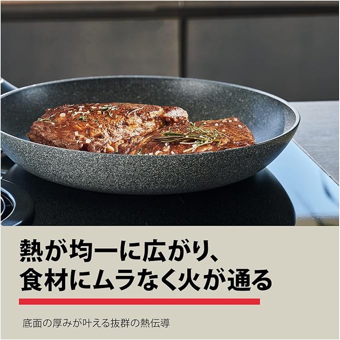 厚みのある底面で抜群の熱伝導 : 厚みのある底面設計で、熱が均一に広がり、食材をムラなく焼き上げます。耐久性が高く、長期間歪みにくい構造です。