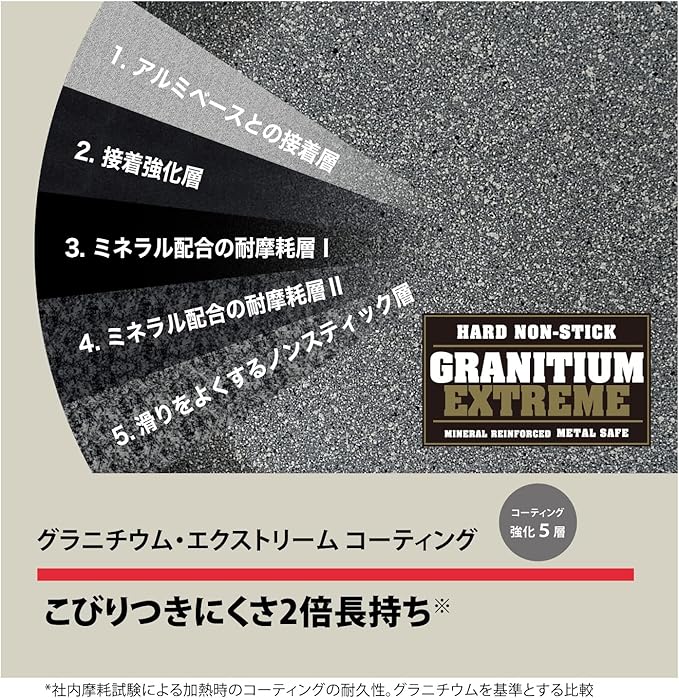 強化5層「グラニチウム・EXコーティング」:独自技術で鉱物を配合し、金属ヘラも使用可能な高耐久コーティング。御影石のような美しい仕上がりで、焦げ付きにくく、快適な調理を長期間キープします。