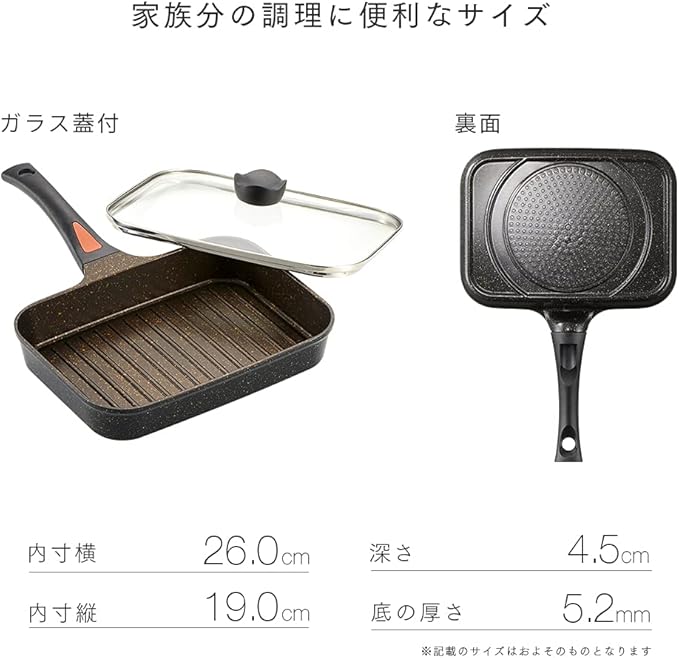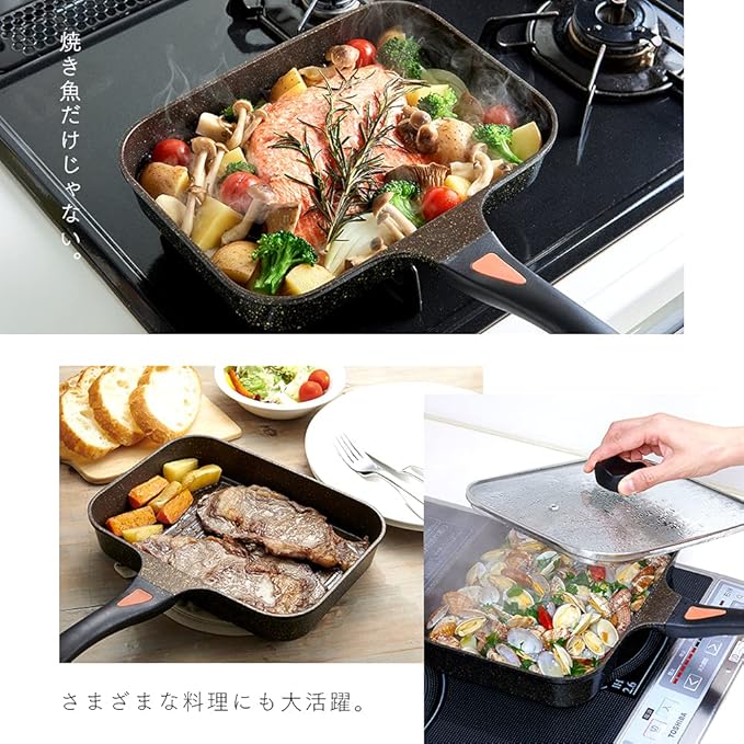 【中が見えやすいガラス蓋付き】中が見えるガラス蓋付きなので調理の状態が見えやすい。蒸し焼き料理にもおすすめ! 横にワイドな長方形型なので、魚を切らずに丸ごと焼くことも可能です。