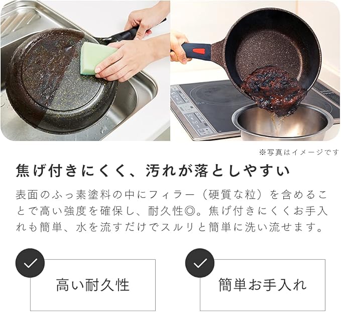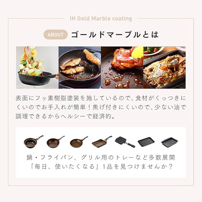 【ゴールドマーブル加工】表面にフッ素樹脂塗装を施しているので、食材がくっつきにくいのでお手入れが簡単! 焦げ付きにくいので、少ない油で調理できるからヘルシーで経済的。また、焦げ付きにくく、汚れが落としやすい! 表面のふっ素塗料の中にフィラー(硬質な粒)を含めることで高い強度を確保し、耐久性◎。焦げ付きにくくお手入れも簡単、水を流すだけでスルリと簡単に洗い流せます。