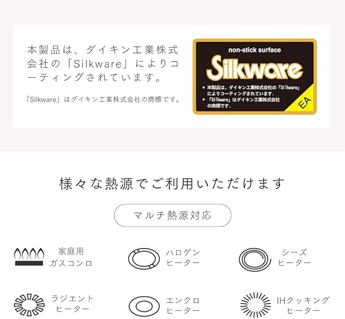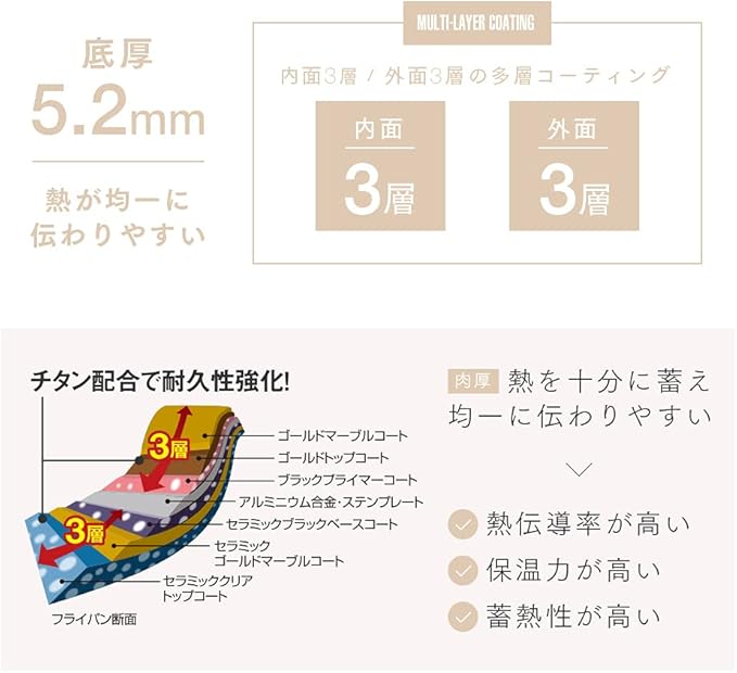 【底厚5.2mmで熱が均一に伝わりやすい】底厚なので、熱伝導率が高く、保温力が高いです。また、蓄熱性にも優れています。コーティングも内面3層 / 外面3層の多層コーティングの仕上がり。※本製品は、ダイキン工業株式会社の「Silkware」によりコーティングされています。(「Silkware」はダイキン工業株式会社の商標です)