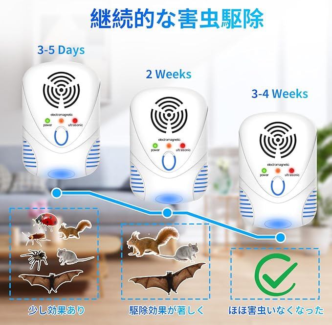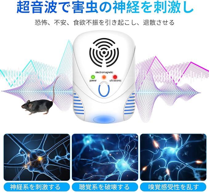 【駆除原理】超音波ネズミ駆除器は最先端のマイコン制御原理を採用しています!電磁波+5種類超音波+圧力波の周波数パルス音波を発信することで害虫を強力に撃退します。蚊、アブラムシ、クモ、ナンキンムシ、ゴキブリ、ネズミ、ノミ、アリ、などの害虫、強力な音波の衝撃で聴覚や神経系にダメージを受け、屋内から逃げ出してしまいます。注:この製品は屋内の害虫を撃退するもので、殺虫効果はありません。